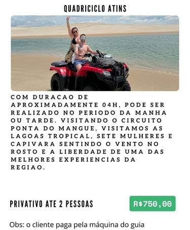 O Vilarejo de Atins ainda mantém uma pegada de turismo raiz alinhado com o requinte do comércio local. Além de experiências únicas como uma cavalgada nas dunas ou os plâctons bioluminescenses, ainda contamos com um requintado comércio local com pousadas e restaurantes de alto padrão.